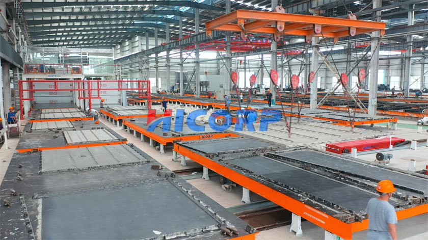 青島環球集團 PC 構件生產線具有多種組織方式 , 包括 : 環形生產線、柔性生產線、游牧式生產線固定臺座式生產線、可重組預應力長線臺座生產系統。